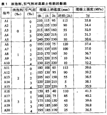 外加劑摻量為膠凝材料的1%,聚羧酸系減水劑復(fù)配不同比例消泡劑和引氣劑對(duì)混凝土性能的影響見(jiàn)表1。