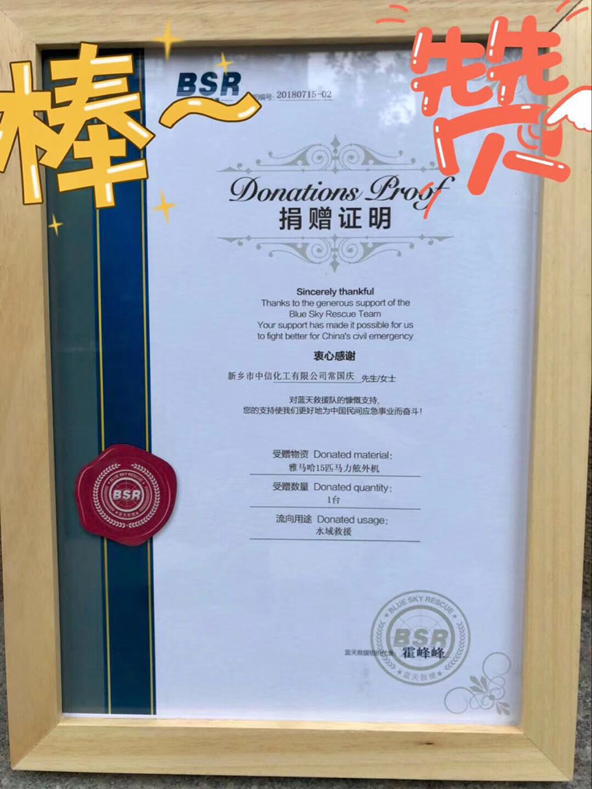 感恩生命,感恩生命中有您。中信化工一直心系社會(huì),堅(jiān)持社會(huì)公益,此次中信領(lǐng)導(dǎo)層來(lái)到新鄉(xiāng)藍(lán)天救援隊(duì),向救援隊(duì)捐贈(zèng)雅馬哈15匹馬力舷外機(jī),幫助救援隊(duì)更好的水上救援。